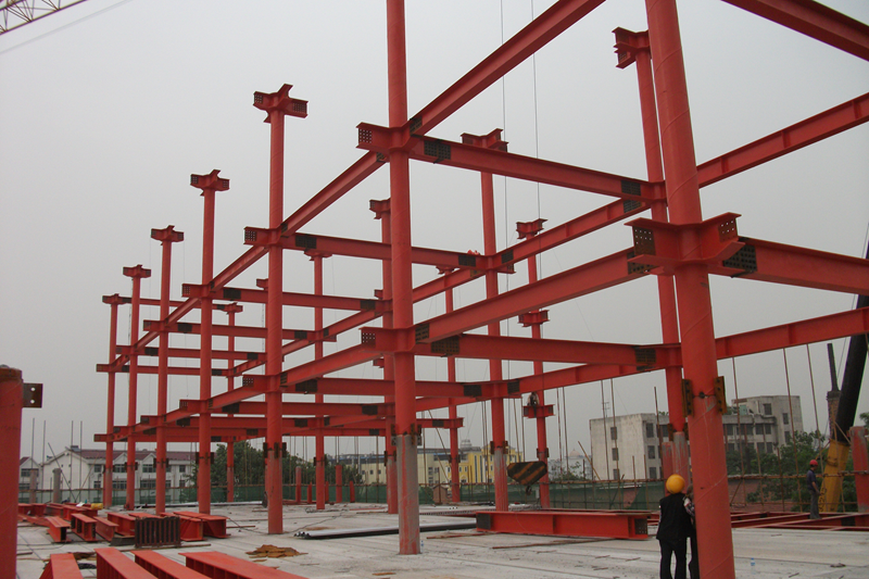 临潼商城钢工程,总建筑面积约24547平方米,地上面积20383.3平方米.主体为五层钢框架结构。总高度为31.5米。框架钢柱为焊接园型柱,钢梁为焊接H型钢梁,楼面为压型钢板与混凝土叠合楼板。