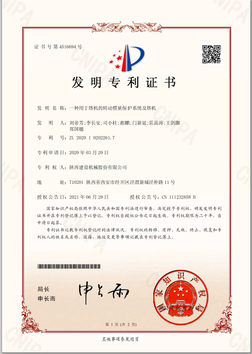 近日,陕建机股份公司《一种用于塔机的转动惯量保护系统及塔机》获国家知识产权局颁发的发明专利证书。