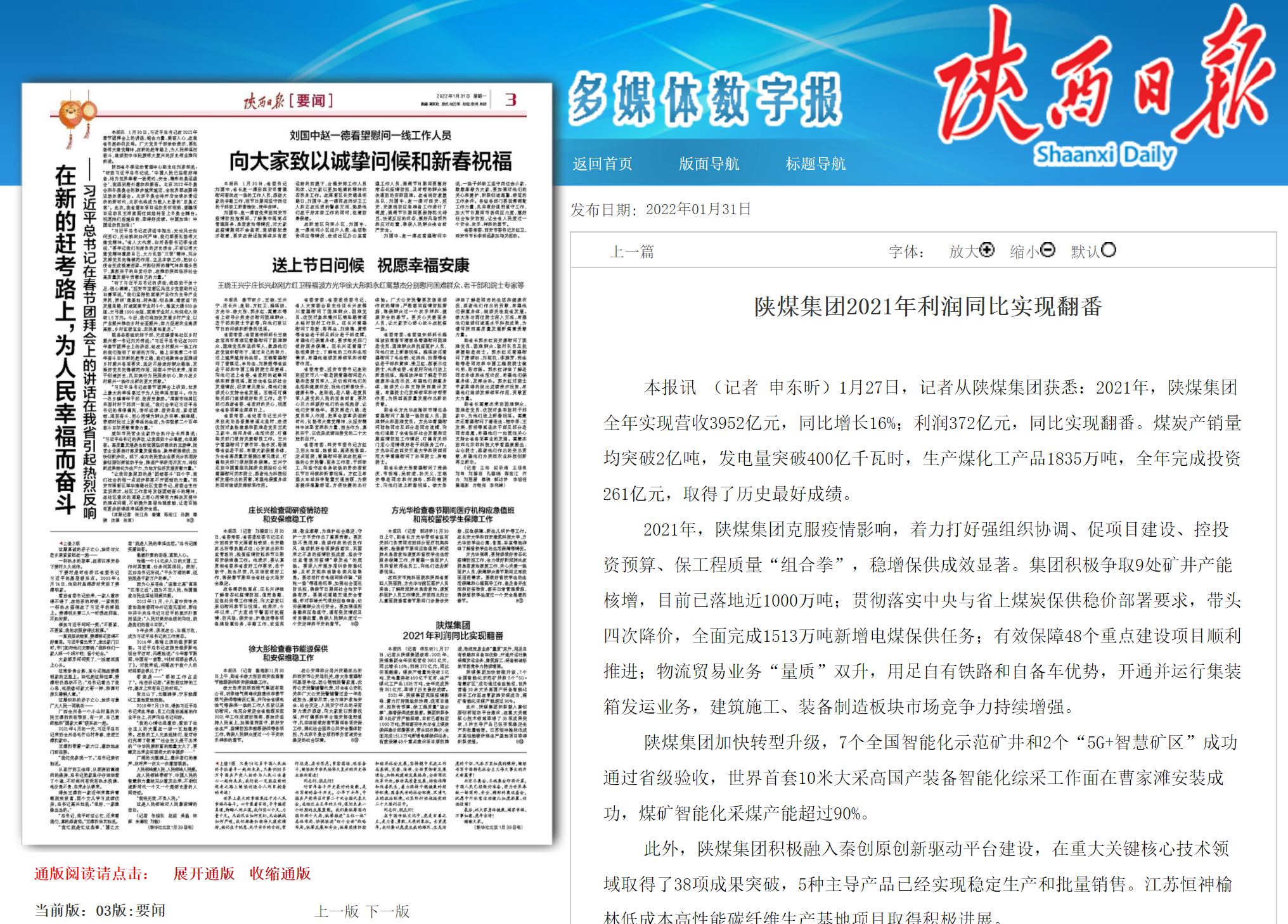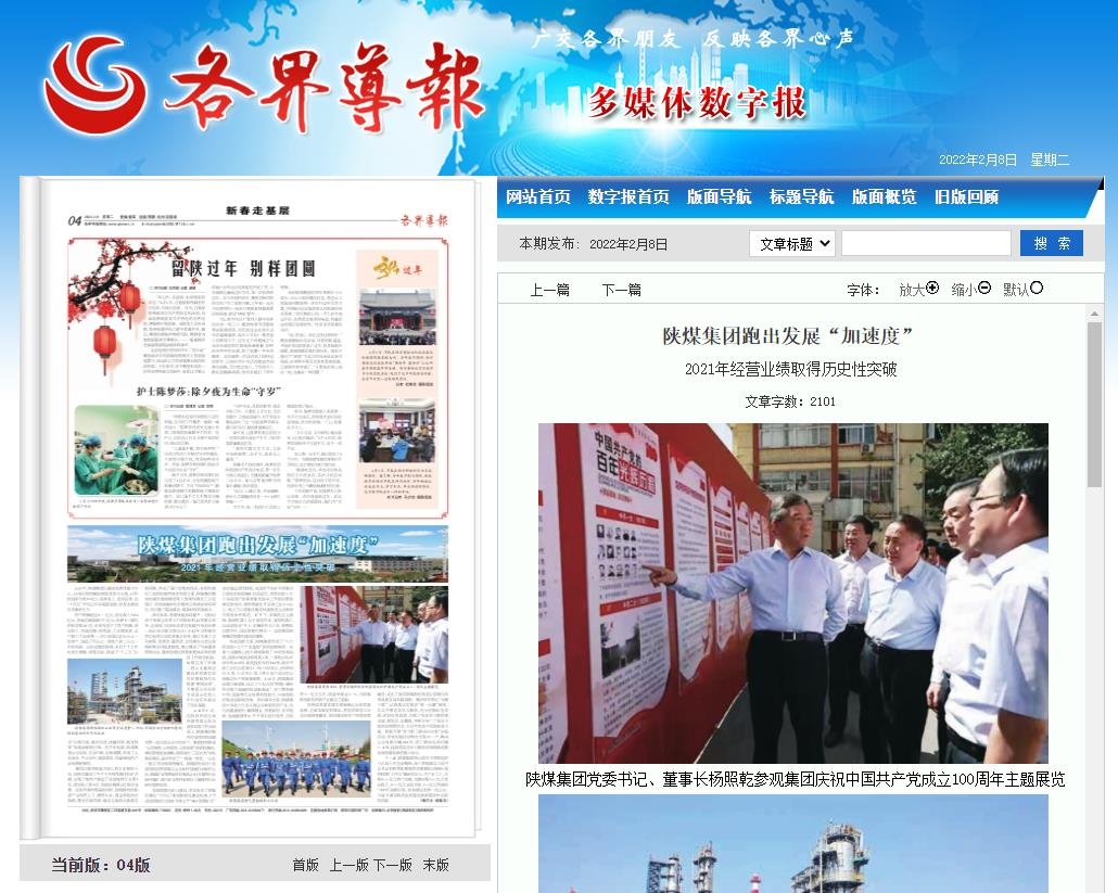 陕西日报 | 陕煤集团2021年利润同比实现翻番
