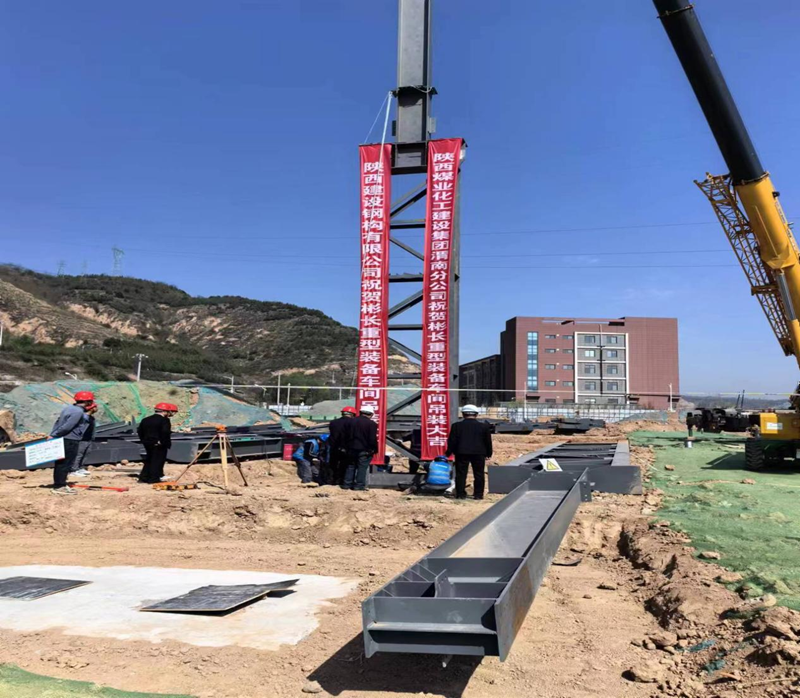 建设钢构顺利完成陕西彬长矿区服务中心重型装备修理车间工程项目首根钢柱吊装任务